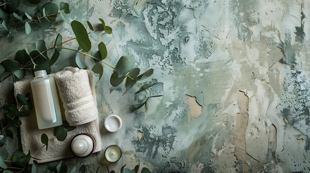 A flat lay of premium spa products, such as rich body lotions, fragrant candles, and a soft loofah, elegantly placed on a smooth stone surface.