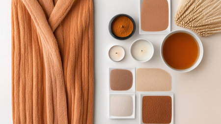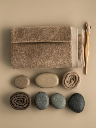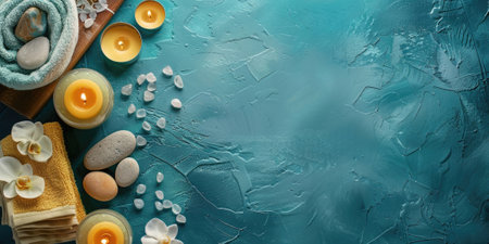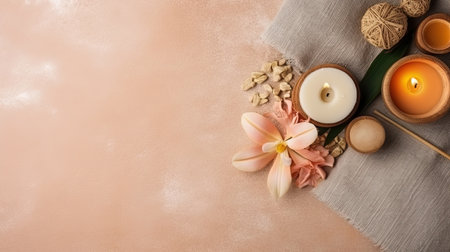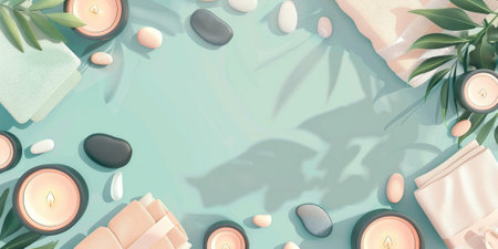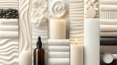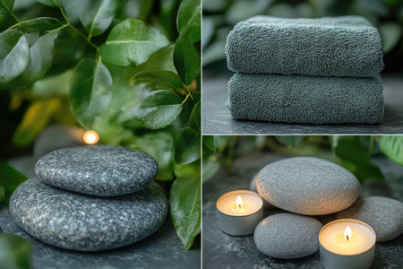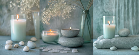 Wellness and relaxation concept featuring spa essentials such as burning candles, soft towels, and massage stones, creating a tranquil atmosphere