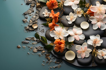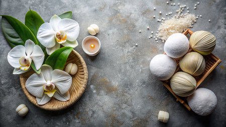 Spa treatment with orchids and stones. Relaxing and peaceful scene.