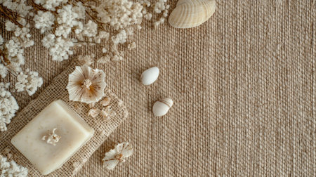 Organic soap with wildflowers, seashells, and soft stones on a natural fiber mat, creating a beachy, bohemian atmosphere.