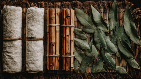 A beautifully arranged spa setting featuring soft white towels, bamboo sticks, and fresh green leaves on a natural bamboo mat, creating a serene atmosphere for relaxation.