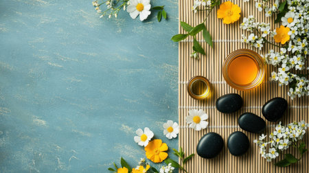 An overhead shot of spa elements including flowers, herbs, and stones arranged on a dark textured background, creating a relaxing and natural atmosphere.