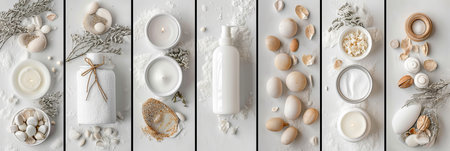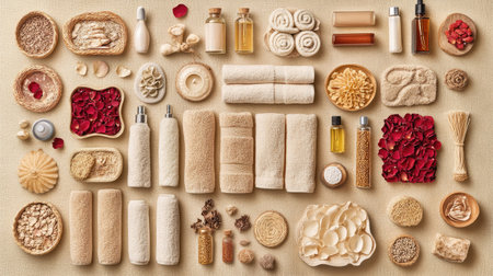 A flat lay of various natural spa products, suggesting self-care, beauty, and holistic wellness rituals.