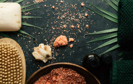 A collection of different spa-related items arranged on a gray background, as seen from above. The i