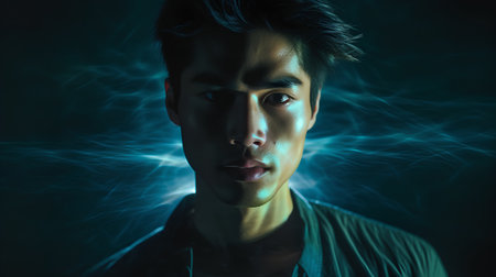 young asian man looking away while standing on blue foggy background