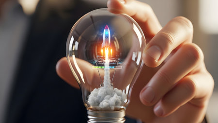 Glass showing hand holding a light bulb with a rocket launching inside symbolizing startup and...