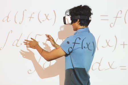 Rear view of mixed race student boy gesturing hands while analyzing math calculations in VR device