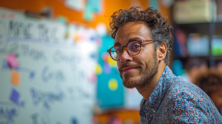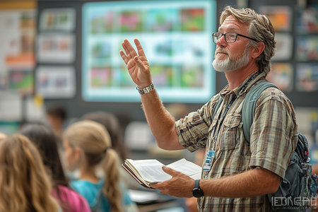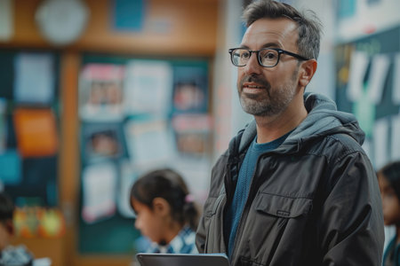 Middle-aged teacher with eyeglasses in the classroom setting, looking at the camera and demonstrating a professional teaching approach