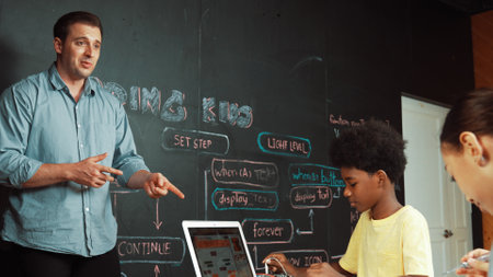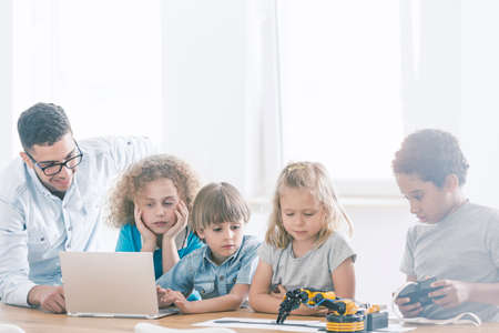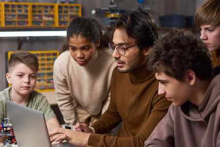Side view portrait of young male teacher using laptop with diverse group of children in robotics and programming class at school
