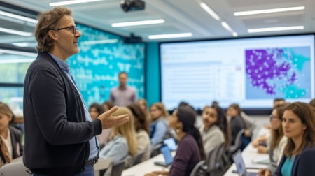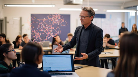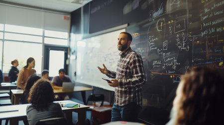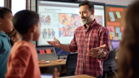 A teacher passionately explains concepts to engaged students in a vibrant classroom setting during a lesson.