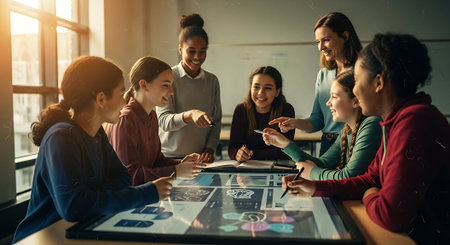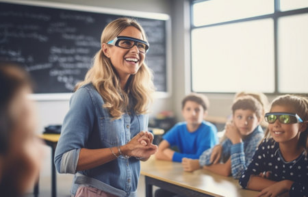 Generative AI : Smart woman teacher in glasses helping students to to schoolwork during lesson in light classroom at school