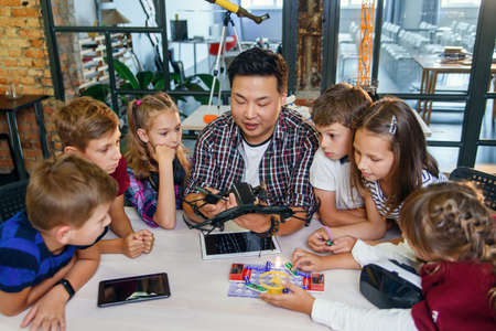 In physics and mechanics lesson young Asian teacher demonstrates quadcopter for caucasian pupils at class in modern smart school. Science, drone, engineering and future concept.