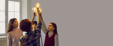 Young bright minds join creative powers. Text background with children holding up shining light bulbs as metaphor for effective solution to problem, progress, innovation, education, kids sharing ideas