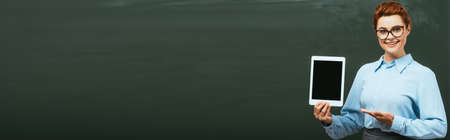 horizontal image of smiling teacher pointing with hand at digital tablet with blank screen near chalkboard