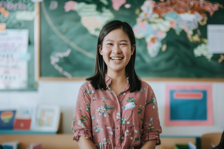 A young woman in a floral blouse stands in front of a classroom, smiling brightly at the camera.
