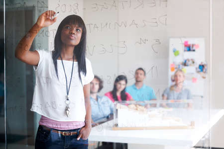 Female teaching in design workshop, training or presentation with a woman employee coaching her team of staff. Black business woman talking to a team on a glass wall and planning during a meeting