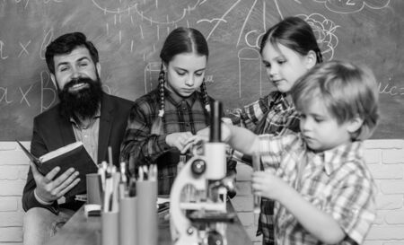 students doing science experiments with microscope in lab. school kids scientist studying science. happy children teacher. back to school. Little kids learning chemistry in school laboratory