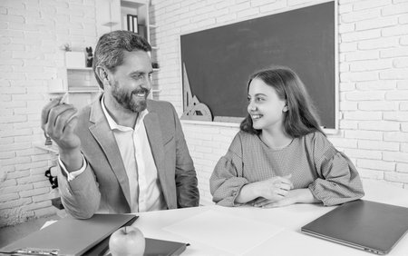 School teacher and schoolgirl. Help study. Discipline upbringing. Lesson is finished. Man bearded pedagogue study together with kid. Study is fun. Task successfully done. Homeschooling with father
