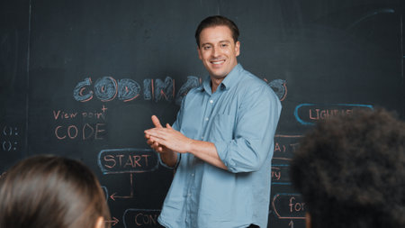 Professional happy teacher answering student question about coding program while standing at blackboard. Caucasian girl learning programing system while attend in STEM technology class. Edification.