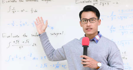 An Asian female teacher in a classroom near the whiteboard is writing and teaching a lesson with a special lecture in a class column. Math teacher explains arithmetic sums to university students.