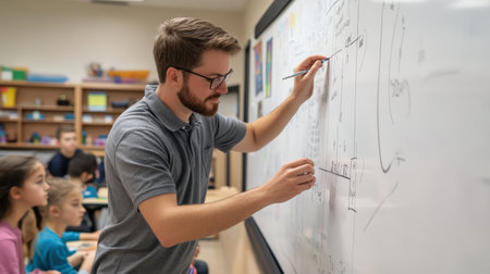 Middle-aged science teacher in a classroom setting, using the whiteboard to teach students about science concept