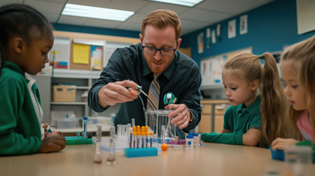 School club education. Teacher and pupils test tubes in classroom. Chemistry themed club. Kids can grow in area of club such as science. Discover and explore properties of substances together