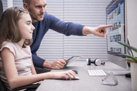 Caucasian Father in His 40s and His Daughter Working on School Project in Front of Desktop Computer. Men Pointing Something with His Finger on Desktop Computer Screen. Online Home Schooling Theme.