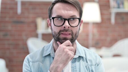 African-American man in a blue shirt and glasses looks up with a smile and a thoughtful expression on a white background