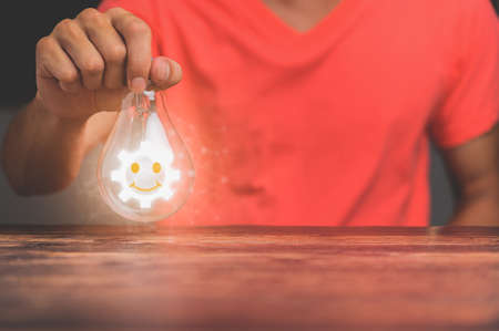 The hand of a man with a light bulb. The idea of ​​inspiration from online technology.innovation idea concept.