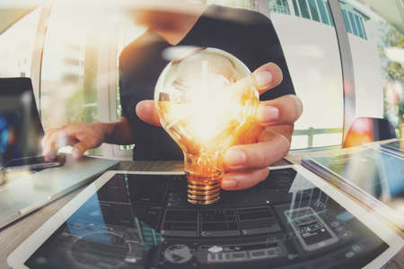 Double exposure of man's hands holding and using a digital device and bulb hologram drawing. Idea concept.