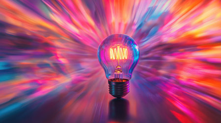 A lightbulb explodes with vibrant colors, symbolizing creative energy.