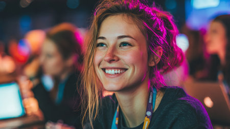Candid portrait of a happy young woman at tech conference, wearing badge, vibrant neon lighting, laptops and crowd blurred in background.
