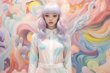 Digital art portrait of a person with pastel hair against a vibrant, dreamlike abstract backdrop