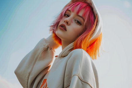 beautiful young girl with pink hair in a white sweatshirt with a hood on her head