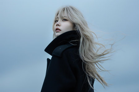 Young beautiful asian woman with long blond white hair wearing black t-shirt.AI Generative.