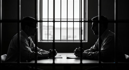 Lawyer and client are seated at a table in a shadowy room, with barred window creating a dramatic atmosphere, highlighting the tension of the legal defense process