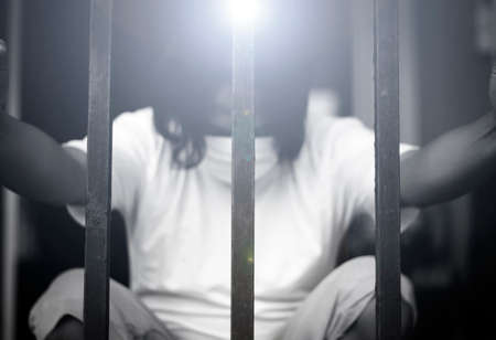 Man in prison hands of behind hold Steel cage jail bars, Male prisoners were severely strained in the dark prison, Imprisonment, violence, human trafficking, prison and prisoner concept.