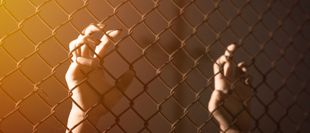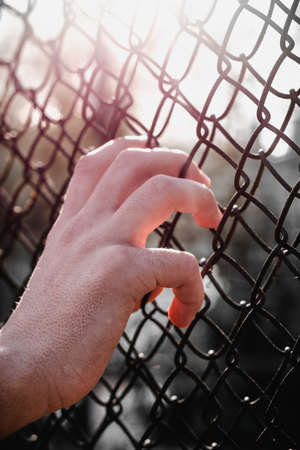 Young man hand holding on chain link fence for freedom, Human Rights Day, immigrant concept.