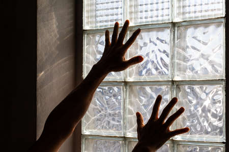 Close-up, silhouette, hands and arms of a Thai man making a melancholy gesture inside a room with a brick glass wall.