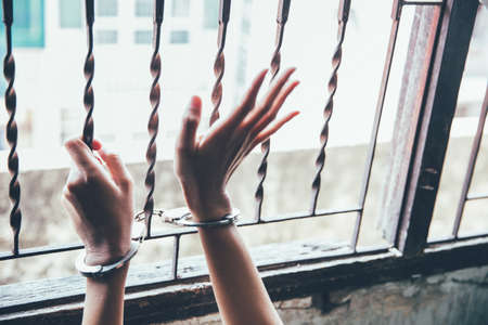 Woman in prison hands of behind hold Steel cage jail bars. offender criminal locked in jail. Prisoner hands close up holding metal cage in jail. law concept