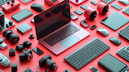 Various electronic gadgets, including laptops, cameras, and speakers, are neatly arranged on a neutral background, showcasing a blend of technology and design.