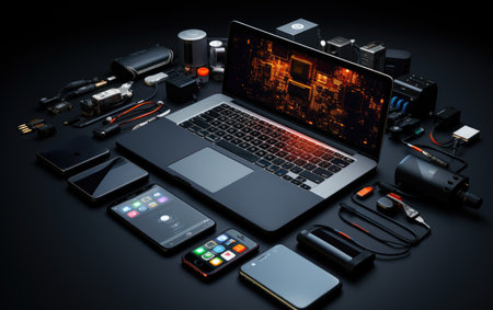 A modern workspace with a variety of charging devices and stations for smartphones, laptops, and other gadgets, showing convenience and innovation.