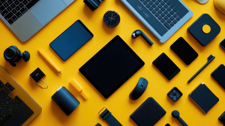 Flat lay of digital devices like tablets, phones, and smart gadgets arranged symmetrically