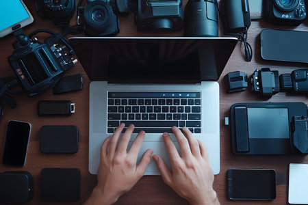 A modern workspace filled with high-quality photography equipment and technology, showcasing a creative environment ideal for professionals and enthusiasts.