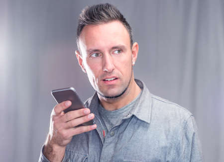 Handsome young man using his smart phone. Using smartphone for voice message wearing urban hipster outfit
