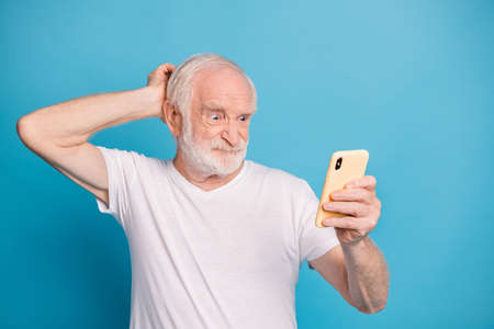 Portrait of unsatisfied person hand behind head staring phone grimace bad mood isolated on blue color background