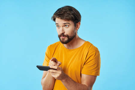 a man in a yellow t-shirt on a blue background with a mobile phone in his hand