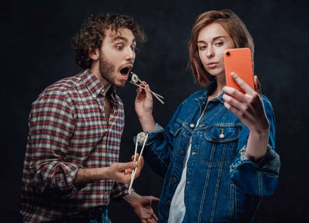 Young fashionable loving couple having fun together, girl feeds her boyfriend fresh delicious sushi rolls and takes a selfie in dark studio