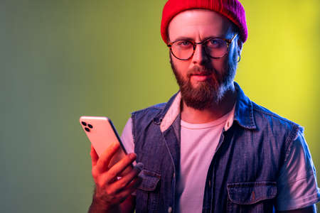 Portrait of serious hipster man holding smart phone, looking at camera with concentrated expression, wearing beanie hat and denim vest. Indoor studio shot isolated on colorful neon light background.