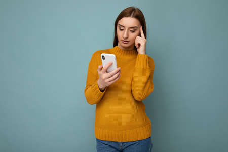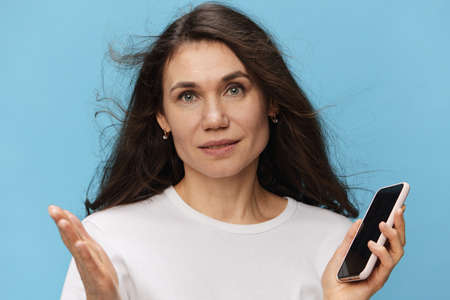 Woman doing Video Call using a phone isolated on blue background. Portrait of surprised upset sad thoughtful minded female looking phone trying to understand information.